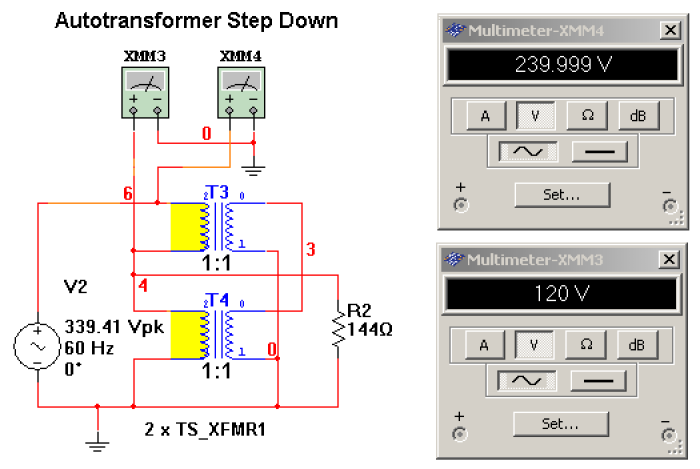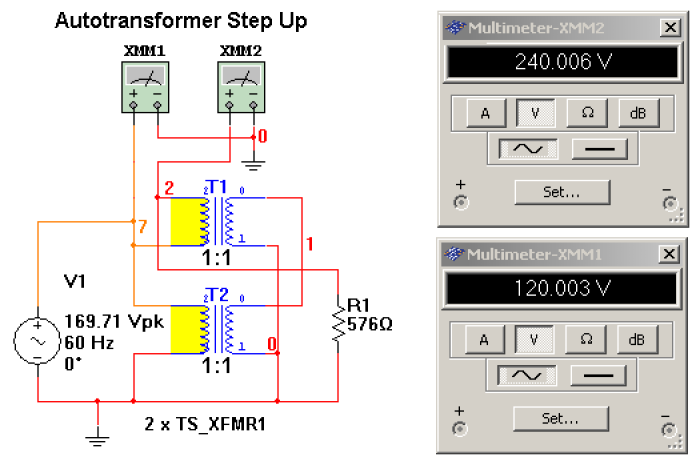 由于我的SPICE版本中并不包括自耦变压器。因此,我必须设计一个使用两个 1:1 匝数比变压器的模型。在图左侧的黄色阴影绕组,正是利用自耦变压器特性之处。两个右侧绕组之间的耦合允许该模型在升压或降压服务中发挥作用,如下图所示: