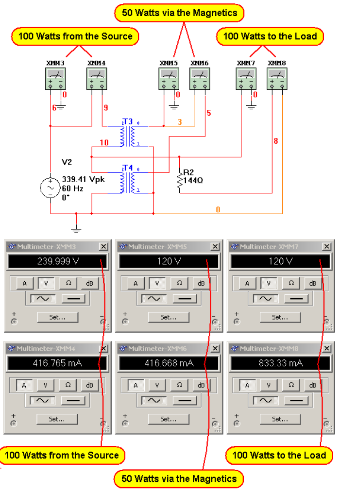 让它以降压方式在 100 瓦(W)负载(为便于说明此处选择任意瓦数)上运作,我们可以检查如下两个右侧线圈的电压和电流,从而查看通过磁体的功率传输: