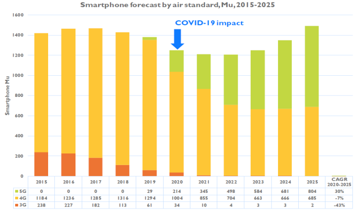 尽管全球手机整体出货量增速放缓,但由于疫情防控让大多数人出行受限,消费者对电子终端产品的消费需求上升。同时随着5G手机带来的技术创新和全新用户体验,5G将赋能手机行业新的增长点。根据Yole Development预测,2020-2025年5G智能手机的年均复合增长率将高达30%,5G手机出货量的快速增长以及5G通信带来的价值量提升将带动射频前端市场规模迅速扩大。