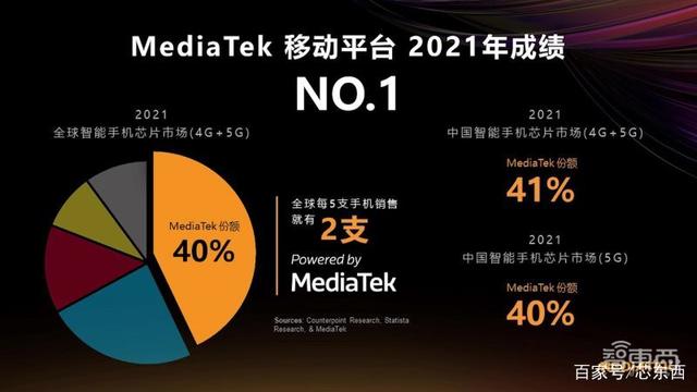 2021年,联发科以4G+5G一共40%的市场份额据全球智能手机芯片市场之首,并且根据市场调研机构CINNO Research的最新数据显示,2021年中国智能手机芯片市场终端销量为3.14亿颗,同比增长3%,当中,联发科以1.1亿颗终端销量位居第一成为了2021年中国智能手机芯片之王。