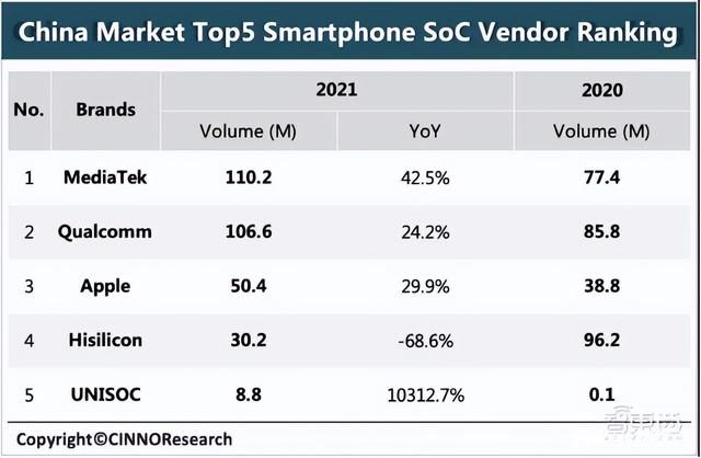 ▲CINNO Research 2021年中国智能手机芯片市场终端销量排行