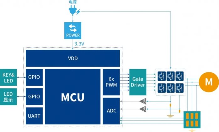 ❷ 提供多路高速PWM定时器、模数转换器(ADC),基于单MCU芯片可实现多个电机的无传感器控制,同时对于有感电机支持编码器输入接口。