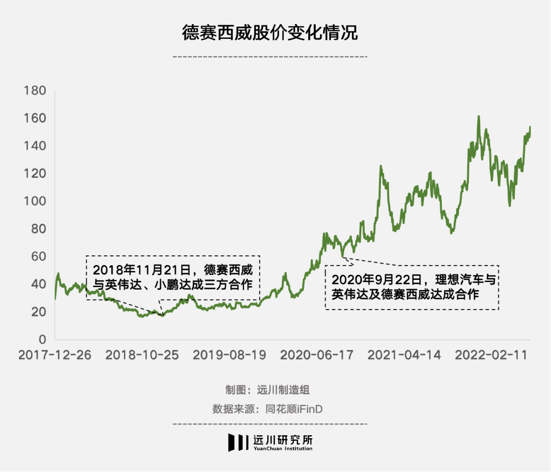直到2018年,德赛西威、英伟达、小鹏汽车签订三方战略合作协议,搭上了英伟达与新势力的快车,德赛西威的股价从2018年末不到18元,涨到了超过150元,市值也随之起飞。