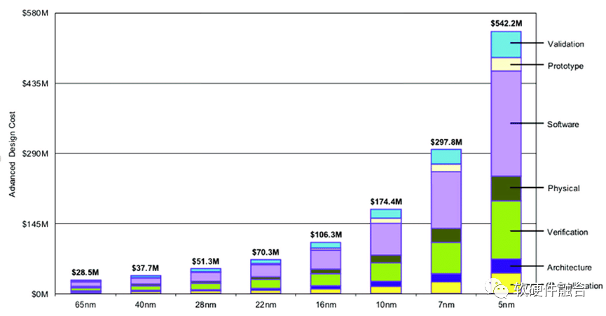 在先进工艺的设计成本方面,知名半导体研究机构Semiengingeering统计了不同工艺下芯片所需费用(费用包括了):16nm节点则需要1亿美元;7nm节点需要2.97亿美元;到了5nm节点,费用高达5.42亿美元;3nm节点的研发费用,预计将接近10亿美元。