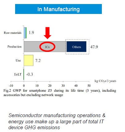 过去半个世纪,由于半导体产业的进步带动了通信技术的高速成长,除了提升人类生活的质量,也对全球经济的发展做出了重大的贡献。但是在制造半导体元件的过程中,也同时消耗了大量的能源与物资,并产生了可观的温室气体和废弃物的排放量。根据Sony Ericsson于2016年针对电子终端产品如Z5智能手机所做的碳足迹研究,在设计、 制造、 配销、 使用的生命周期中,制造部份的半导体生产环节产生了最高的碳排量,每台大约排放33kg的CO2 (如附图):