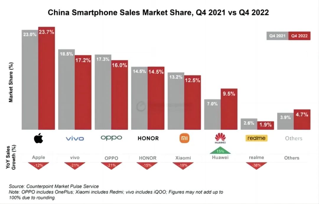 2022年第四季度,中国智能手机销量同比下降15%,且在去年所有季度的销售额均实现了两位数的同比下降。苹果仍是该季度跌幅最为轻微的一个,甚至达到了有史以来最高的季度份额,其在中国市场占比23.7%,与去年同期的23%相比小有提升。