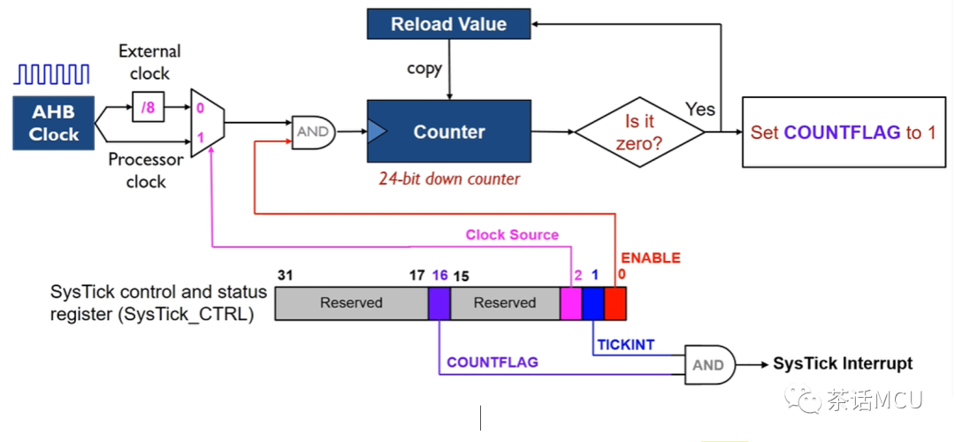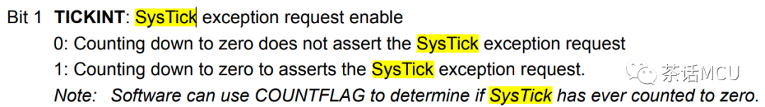 BIT1【TICKINT】掌控SYSTICK中断请求的使能、禁用,类似于STM32各个外设事件的中断请求使能控制位。