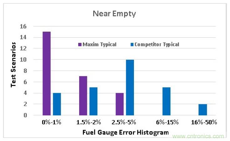 图3所示为系统误差的竞争产品分析。从柱状图可以看出,接近电池没电时,MAX17055在大多数测试用例(26个中的15个)下的误差在1%以内。