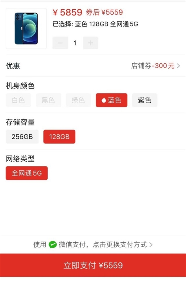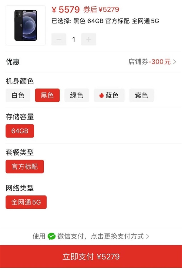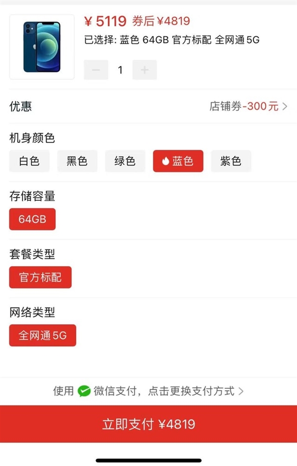 在拼多多平台iPhone12 128G版在补贴后的售价为5559元,还是高于网传的4799元,但是小编发现iPhone12 64G 蓝色版的售价低至了4819元,非常接近网传价格。