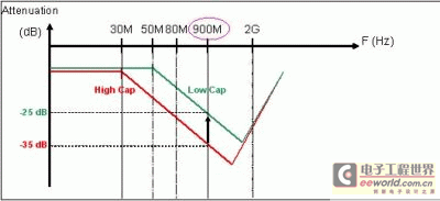 不过设计者知道,在滤波电容值与GSM/CDMA频率上的衰减特性之间存在着无法解决的折衷问题。低电容结构会影响滤波器的高频性能,且目前大多数低电容滤波器都不能在900MHz频率上提供优于-25dB的衰减性能。图2显示了EMI滤波电容对GSM频率衰减的影响。