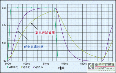 图5显示了工作于40MHz频率上的3V视频信号分别通过高、低电容滤波器的传输情况比较。可以发现,高电容结构所引起的延时是低电容结构的5至6倍。在这种情况下,信号输出电压不能被正确地接收。