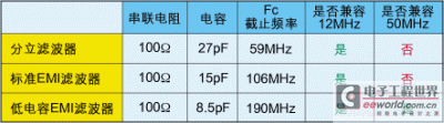 表1给出了几种滤波器电容值与截止频率的对照,以及时钟兼容性。这表明低电容滤波器是最适合高频率、高速数据信号传输的解决方案。