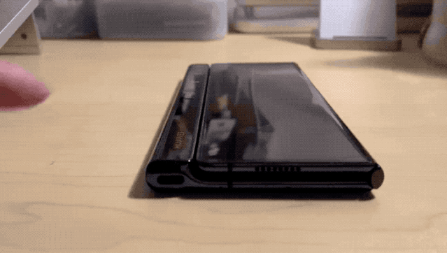 折痕也还在那里,依旧是亮屏正面看不会影响观感,实际上观感也符合预期,强如华为和三星当前都无力消解这个缺憾,多谈也无用。作为少见的外折叠手机,我遇到的第一个问题是「无处安放」。不使用Mate Xs的时候我习惯把它折叠起来,一方面是因为好携带,毕竟这样才能放到兜里,另一方面也是习惯使然,就像两本书要摆放一定要摞起来而不是平铺。