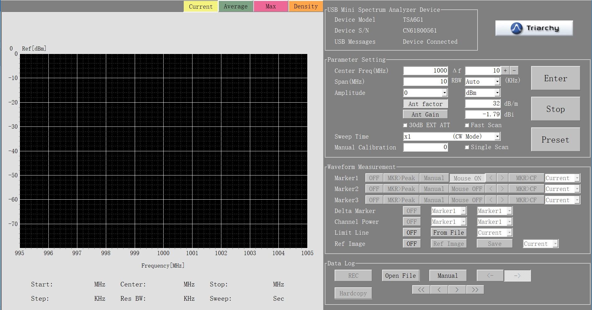 安装成功后,启动软件后可以看到下图窗口显示的信息,将频谱仪接到电脑的USB端口,软件将识别出此USB设备,显示此设备类型和设备的S/N号, USB信息栏显示“Device Connected”。