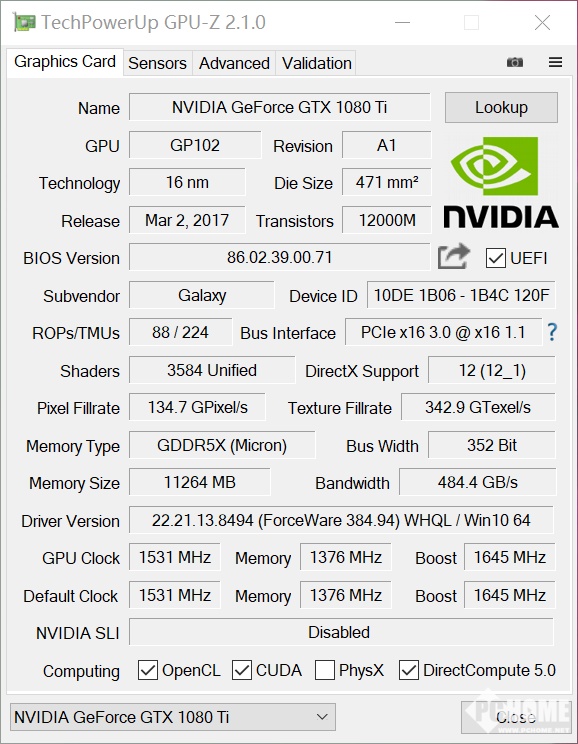 GTX 1080Ti是英伟达10系显卡中的高端系列显卡,其核心为GP102,采用最新的Pascal架构,16nm制程工艺。这块影驰的GTX 1080Ti采用了11GB DDR5显存,位宽为352Bit,基础频率为1531MHz,睿频可达1645MHz,配有3584流处理器。