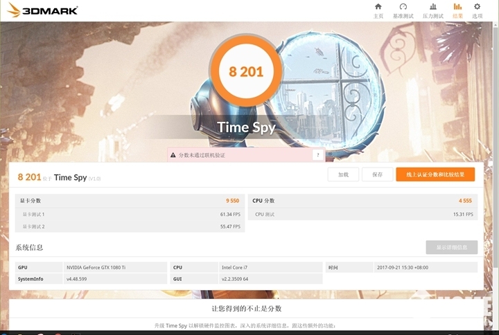 为了顺应DX12的潮流,3DMark在其新版本中推出了全新的测试组件:Time Spy。充分融入了DX12的相关革新技术,严格考核显卡和CPU的DX12性能。一座太空博物馆内无数藏品,每个场景都有丰富的细节和阴影,堪称是目前画面最为复杂的性能测试场景。 Time Spy图形测试渲染分辨率为2560*1440,测试场景没有太大变化,依旧分为演示DEMO、显卡测试、CPU测试三个步骤。该项测试中,名龙堂剑龙GM12获得了8201的分数,相当不错的成绩。
