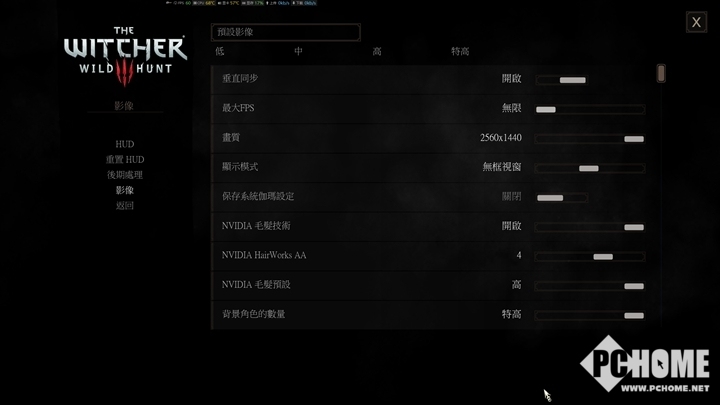 《巫师3:狂猎》由CD Projekt RED制作的RPG游戏,游戏引擎为RED自主研发的REDengine 3,游戏环境比较复杂,植被、特效和纹理细节等方面的制作都相当出色,但同时也非常吃配置,如果显卡性能无法达到全高游戏画质的要求的话,游戏运行会非常卡。 我们将游戏分辨率设定为2K,其余特效全部为特高。