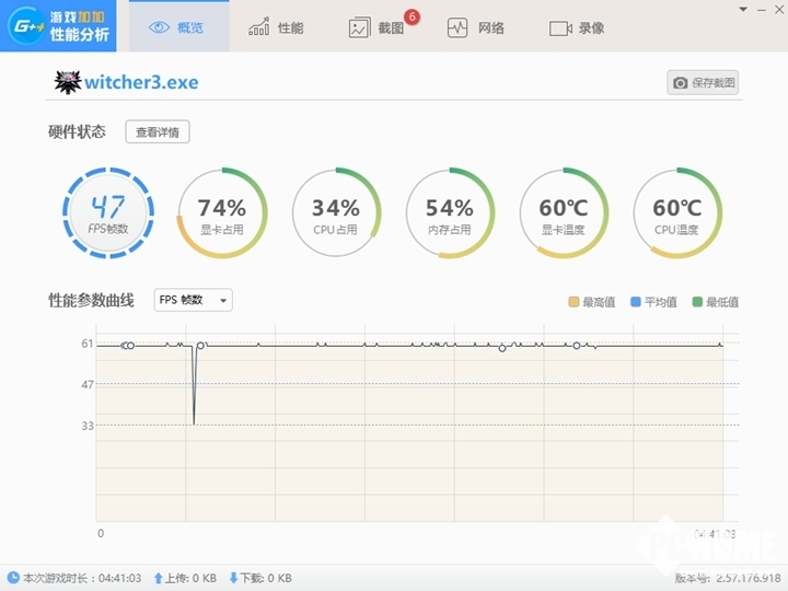 而在运行《巫师3》游戏时,持续4个小时的游戏测试中,游戏平均帧数在47FPS,显卡的实际占用率在74%以上,显卡温度保持在60°C,CPU温度也在60°C,可见一体式水冷加上4把大尺寸风扇的效果非常的出色,保证了整机的稳定冷静运行。
