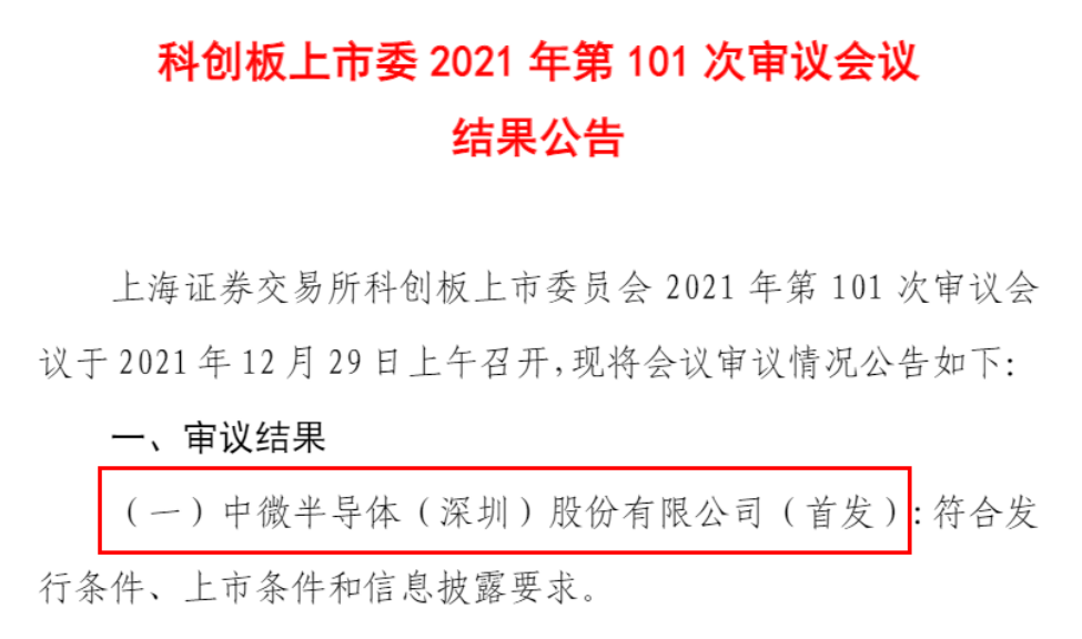 集微网消息 12月29日,据上交所科创板上市委2021年第101次审议会议结果显示,中微半导体(深圳)股份有限公司(下称“中微半导”)科创板IPO成功过会。