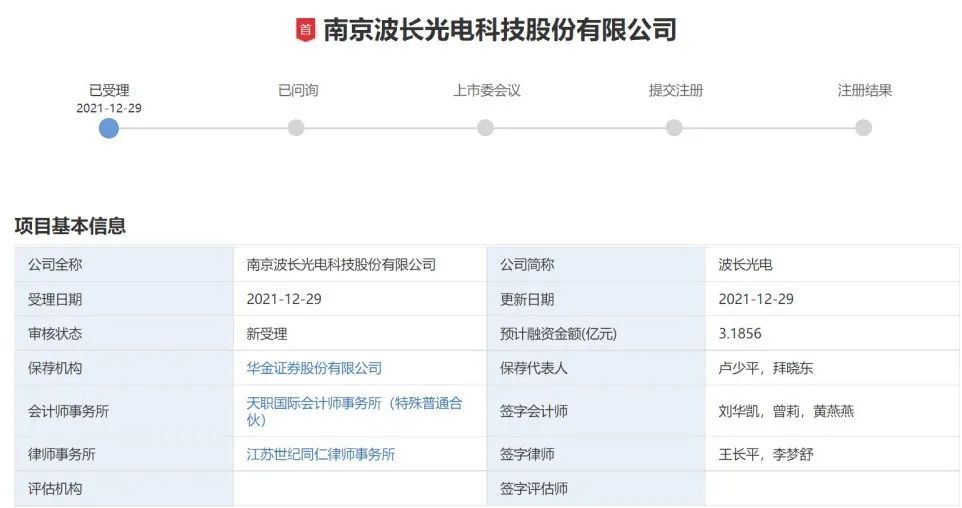 集微网消息,12月29日,南京波长光电科技股份有限公司申请在创业板上市已获受理。华金证券股份有限公司为其保荐机构。