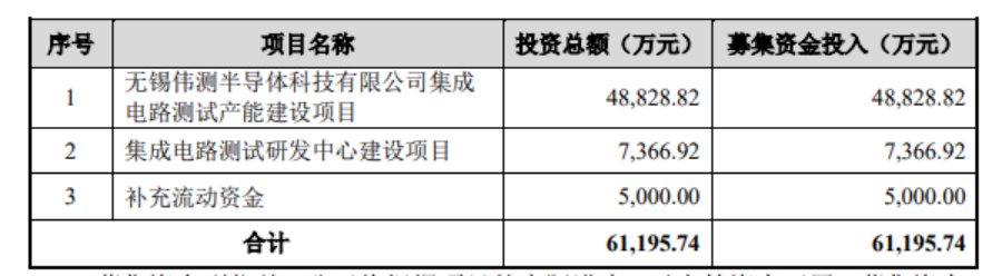 招股书显示,伟测科技本次拟募资6.12亿元,其中,4.88亿元用于无锡伟测半导体科技有限公司集成电路测试产能建设项目,7366.92万元用于集成电路测试研发中心建设项目,其余5000万元则用于补充流动资金。