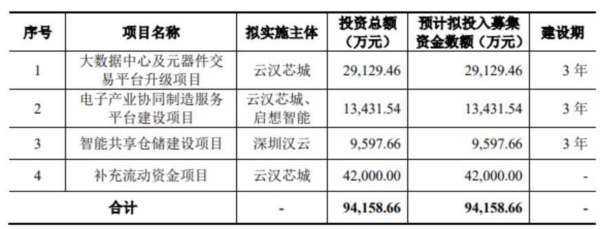 招股书显示,云汉芯城此次IPO拟募资9.42亿元,投建于大数据中心及元器件交易平台升级项目、电子产业协同制造服务平台建设项目、智能共享仓储建设项目以及补充流动资金项目。