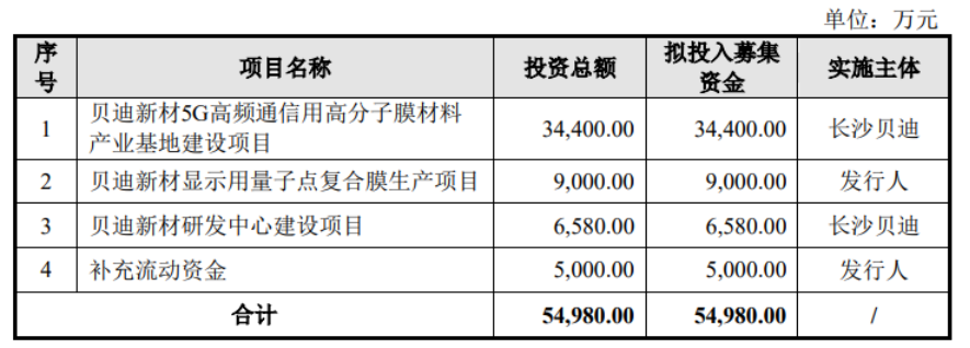 据悉,该公司此次拟募资5.49亿元,主要用于:“贝迪新材 5G 高频通信用高分子膜材料产业基地建设项目”、“贝迪新材显示用量子点复合膜生产项目”和“贝迪新材研发中心建设项目”