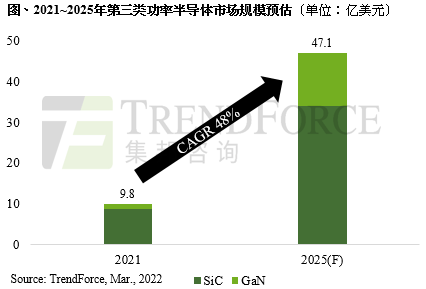 TrendForce集邦咨询研究推估,第三代功率半导体产值将从2021年的9.8亿美元,至2025年将成长至47.1亿美元,年复合成长率达48%。