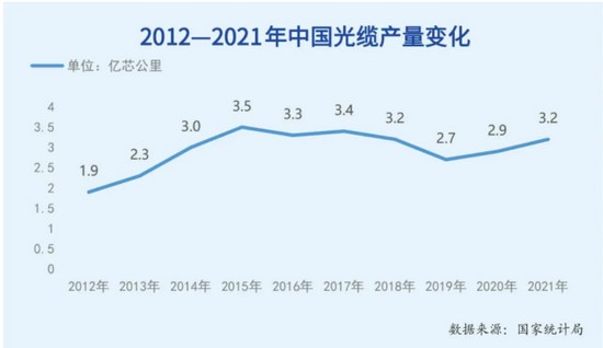 据国家统计局数据,仅用三年时间,中国光缆年产量就从2012年的1.9亿芯公里快速增长到2015年的3.5亿芯公里,年复合增长率达到了22.6%,远超同期全国GDP增长率。此后数年里,乘着4G、FTTH网络建设的东风,直到2018年,全国光缆年产量始终保持在3亿芯公里以上。