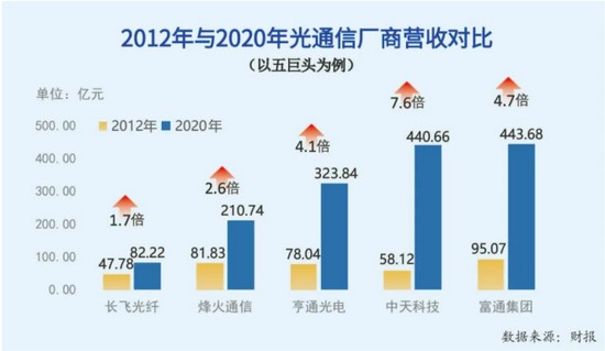 回顾过去10年的光纤光缆行业业绩,普遍趋势是营业收入大涨,甚至翻番。以五大光通信巨头为例,据年报,2012年,长飞光纤营收47.78亿元,烽火通信营收81.83亿元,亨通光电营收78.04亿元,中天科技营收58.12亿元,富通集团营收95.07亿元。而到了2021年,已披露业绩的三家厂商中,长飞光纤营收95.36亿元,烽火通信营收263.15亿元,亨通光电预计营收410亿元。这三家厂商2021年的营收分别是2012年的2倍、3.2倍和5.3倍,这还是在克服疫情影响下取得的业绩,如果是对比疫情前的业绩,增长数字会更高。