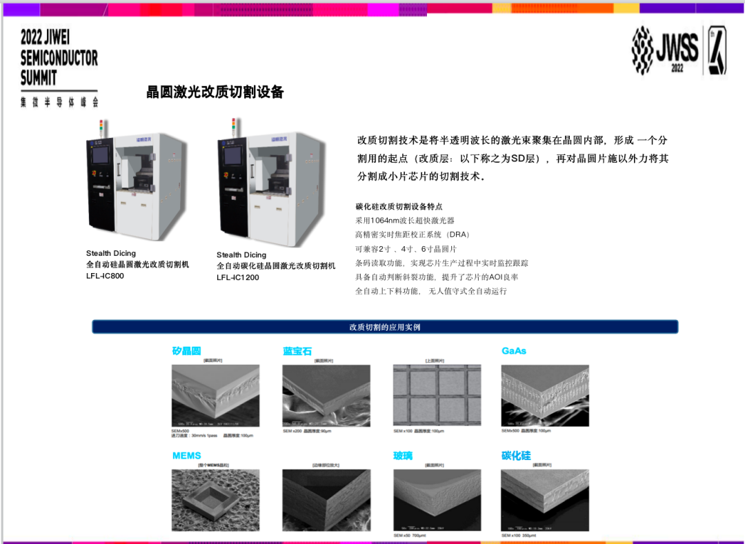 集微网消息,2022年7月16日,以“裂变:从混沌到有序”为主题的六届集微半导体峰会在厦门国际会议中心酒店隆重召开。作为峰会十七大亮点环节之一,半导体设备材料论坛吸引了来自国内前后道设备、光刻胶材料和激光精密加工设备等企业高管齐聚一堂,围绕半导体设备材料领域的市场现状、前沿趋势、发展瓶颈和国产替代进程等重要话题进行了深入探讨。苏州镭明激光科技有限公司市场部副总符召阳在设备材料论坛上,苏州镭明激光科技有限公司市场部副总符召阳在名为《激光精密加工在半导体的应用》的主题演讲中表示,激光器在航天、医疗设备等各种制造业里都有大量的应用。对此,镭明激光想方设法将激光器稳定性好、质量高、寿命长的特点结合应用在半导体领域,以及通过软件良好控制设备的构造。据符召阳介绍,“镭明激光于2012年4月成立,最初主攻的是LED方面刻蚀的设备,2015年开始做激光开槽部分设备研发,2019年正式通过封测厂的验证,2021年设备批量出机。”未来,公司将立足华东、服务全国、展望全球,最终目标是成为全球半导体领域激光应用领军企业。不过,由于大环境处于下行趋势,镭明激光也面临不可避免的挑战。符召阳认为,“我们既要跟竞争对手抢占市场份额,跟封测厂谈怎么降低成本,还要跟刀片切割厂商PK。因此,我们经过几年技术沉淀和研发,聚焦更先进、更高效的泛切割工艺,在未来将实现对传统刀轮切割工艺的替代。目前,我们的设备已经处于客户验证阶段,一旦验证成功效率可以做到刀片设备的3—4倍。这不仅能让封测厂大幅降低厂房面积,还能增加生产效率。”除了晶圆激光开槽切割设备外,对于镭明激光为什么要做激光改质切割设备?符召阳表示,因为有一部分客户的产品需要直接用激光改质切割设备去做。“传统刀片切割的划片槽可能做到窄一点50、60um,普通的70、80um,但改质切割设备可以将划片槽做到很小。对于客户而言,他们从源头流片的时候就改版,让芯片数量直接增加20—30%,这无形中使成本低了20—30%。目前,我们已经与客户达成战略合作,验证完成后就会产生大量需求。”紧接着,符召阳对镭明激光的几款主要产品进行了简要讲解,包括全自动12寸晶圆激光解键合设备、12寸晶圆级激光打标设备、背金开槽设备、激光改质激光切割设备等。“其中,激光解键合设备可以在封测厂流程中做到很薄的薄片,但其他流程上做不到这么薄。至于背金开槽设备,为了避免一些SIC衬底或者直接用刀片切会造成金属的翘曲,我们用自己的技术良好完成了对位和产品的切割。”此外,在介绍激光开槽设备结构及流程时,符召阳指出,开槽流程包括上料区,涂布平台,切割、清洗平台以及退料完成切割。“但开槽要保证客户的产品最怕的是激光灼伤,所以我们的工艺首先用双细线切割做好保护以降低热效应影响,第二步是使用宽光切割开出合适的槽型。另外,改质切割的技术难点在于可能晶圆表面有不平整,或者对位时聚焦不在统一水平线。但我们通过自主的技术能够做到补偿,然后实现统一的水平线完成晶圆切割。”最后,对于公司管理和规划方面,符召阳表示,“从前端的调研、计划、生产,到后面的软件模拟和车间加工,镭明激光都有成套的管理政策和机制。同时,我们的实验室在验证研发的时候大量模拟客户在净化车间的情况,从而能满足客户认证时的使用需求。另外,公司新的实验室大楼预计在明年9月左右完成,总面积约2万平方米。通过新研发中心的IT和ERP系统有效管理,我们将做到更好的备料,更好的产出,更好的服务客户。”近年来,凭借强大的研发能力和过硬的产品质量,镭明激光得到了国家级、省市级的系列认可与肯定,先后获评“国家高新技术企业”、“苏州工业园区企业上市苗圃工程”、“江苏省民营科技企业”、“苏州市瞪羚计划入库企业”、“苏州工业园区科技领军人才”、“2021年度苏州市‘独角兽培育企业”等,并拥有30多项发明专利。(校对/刘燚)