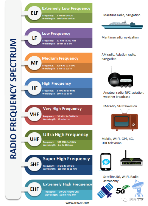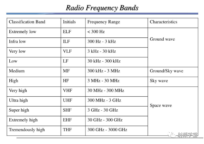 所以呢,鉴于波长λ和频率 f 的对应关系,电磁波根据波长和频率有两种对应的分类方法。比如按照波长划分:长波,中波,短波,超短波,米波,分米波,厘米波,毫米波,亚毫米波等,按照频率划分有甚低频,低频,中频,高频,甚高频,特高频,超高频,极高频,超极高频等。而我们所说的微波通常是指频率在300MHz到3000GHz的电磁波,对应的波长是1米到0.1毫米的范围。而射频呢,Radio Frequency,指我们人类目前应用的用来做信号发射接收的电磁波频谱,IEEE给的定义的的是3kHz到300GHz。有的更定义为整个甚低频到超级高频都是射频频段。我觉得,随着技术的发展,肯定有越来越多的电磁波频谱资源被我们射频人所用。到时候,RF的规模还会扩大。