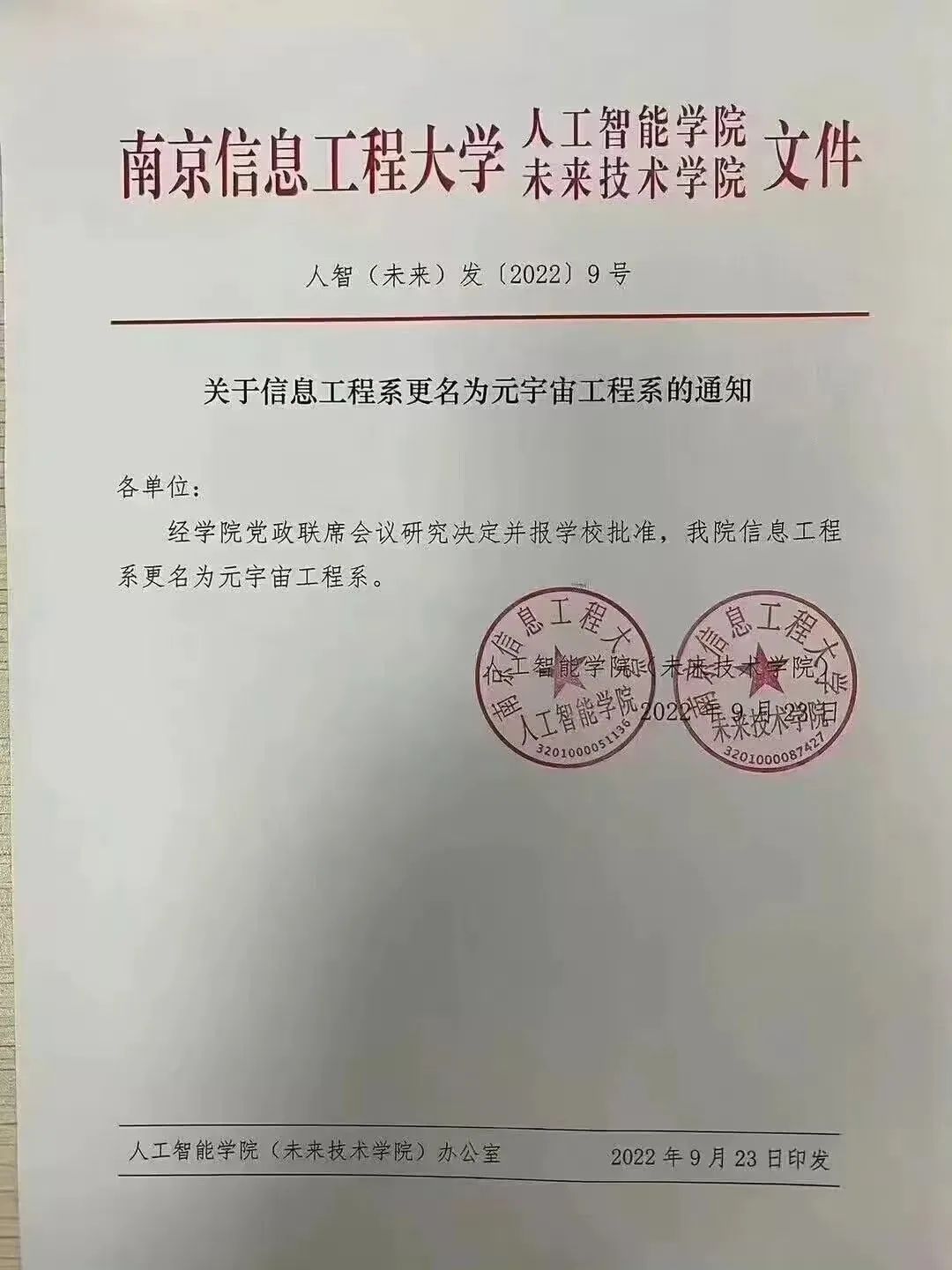 此前,网上流传着一份由南信大人工智能学院(未来技术学院)印发的《关于信息工程系更名为元宇宙系的通知》(以下简称“通知”),该通知显示,经学院党政联席会议研究决定并报学校批准,该院信息工程系更名为元宇宙工程系。通知时间为9月23日。