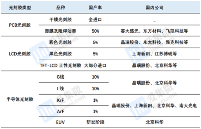 我国光刻胶行业发展起步较晚,因此整体技术实力与国外仍有较大差距。目前国内的厂商多以紫外宽谱、G线、I线等低端领域产品为主,处于低毛利率的产品区间,生产能力主要集中于PCB光刻胶、TN/STN-LCD光刻胶等中低端产品(PCB-94%、面板-93%、半导体-2%)。高端领域的KrF、ArF、EUV光刻胶在技术、产品、产能方面与国外大厂存在较大差距,行业主要依赖进口。据集微网统计,国内半导体光刻胶企业主要包括晶瑞电材(苏州瑞红)、彤程新材(北京科华)、上海新阳、南大光电等。国内光刻胶产品主要集中在g/i线市场,而KrF和ArF光刻胶仍处于技术积累和市场开拓期。不过,国内企业已在KrF以上级别产品中有所突破。