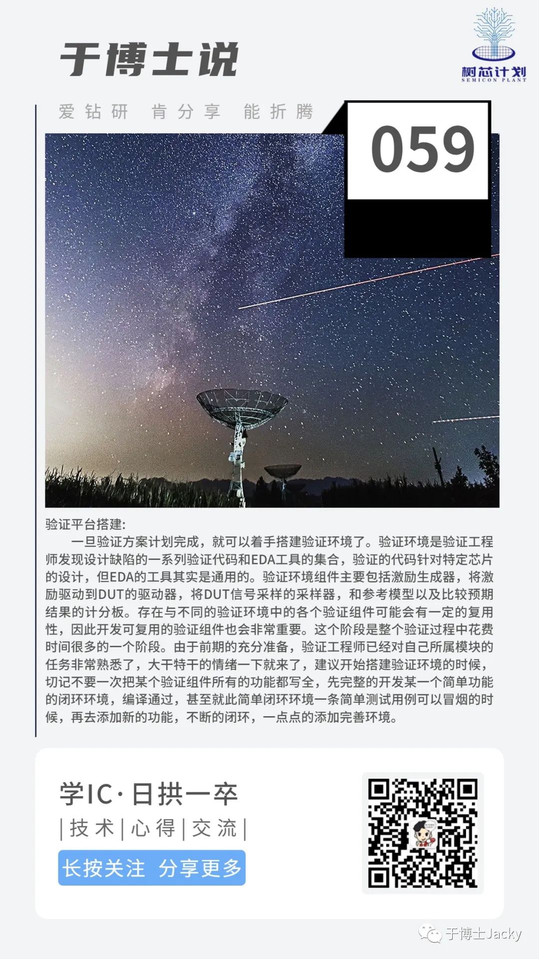 Jacky于博士,本硕博均为西安交通大学微电子专业,十年大厂数字芯片验证经验,对芯片设计验证领域有独到见解,是理论与实践兼备的老鸟。“树芯计划”首席讲师,开设数字验证课程,讲课风趣幽默,善于将理论实践结合。