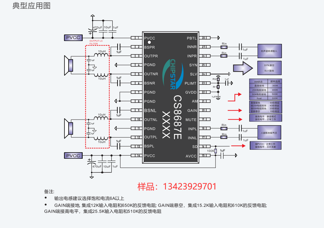 CS8687E是一款2X45W立体声D类音频放大器;在供电电压25V的情况下,负载为8Ω 的情况下最大可以输出2X45W的连续功率,在PBTL模式下最大可以输出88W(负载4Ω )的连续功率;通过主从模式的设置可以让CS8687E实现无限级 联,从而实现系统的多路输出;CS8687E具备先进的EMI抑制技术,它采用表面贴装技术,只需少量的外围器件,便 使 系 统 具 备 高 质 量 的 音 频 输出功率。CS8687E内置了过流保护,短路保护和过热保护,有效的保护芯 片在异常的工作条件下不被损坏。CS8687E最高可达到95%以上的效率, 35V的耐压设计为芯片提供了超高的可靠性,可以有效的降低生产过程中的不良比例。