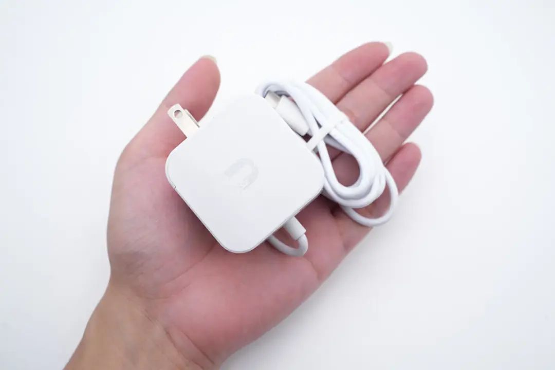 充电器为方块机身造型,配备固定式美规插脚以及自带USB-C输出线,外壳整体磨砂抗指纹。