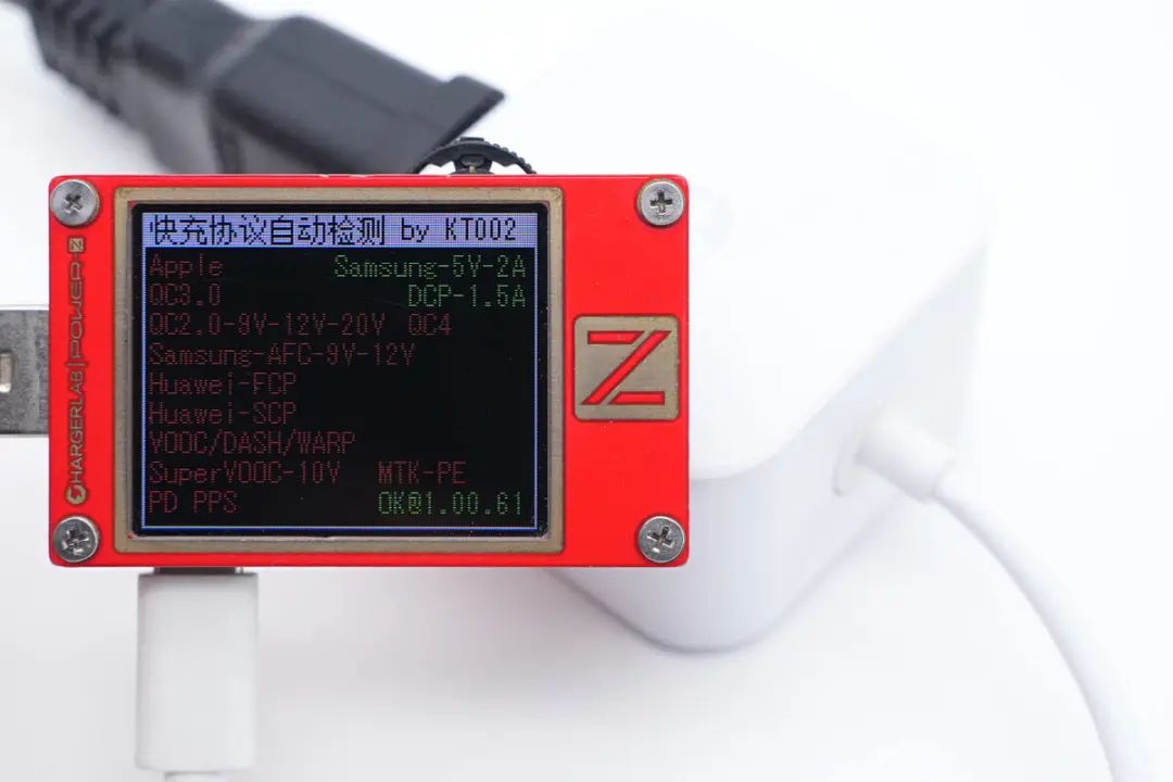 使用ChargerLAB POWER-Z KT002测得充电器支持Samsung 5V2A、DCP充电协议。