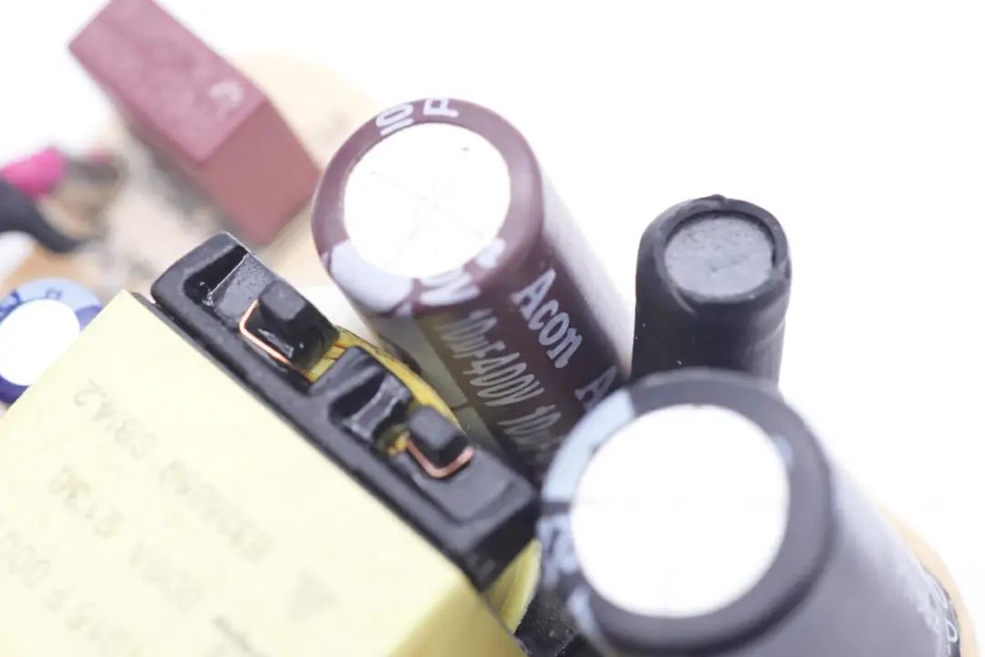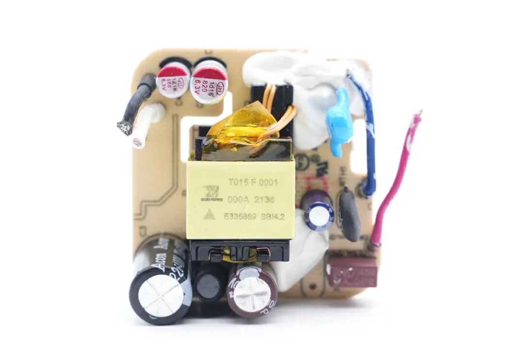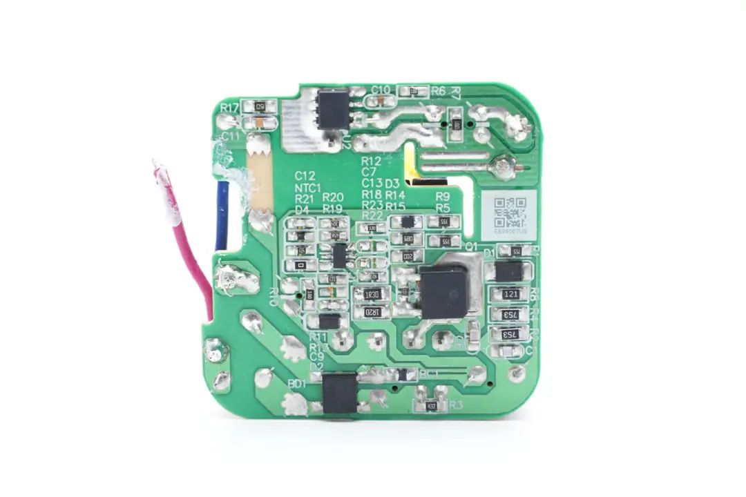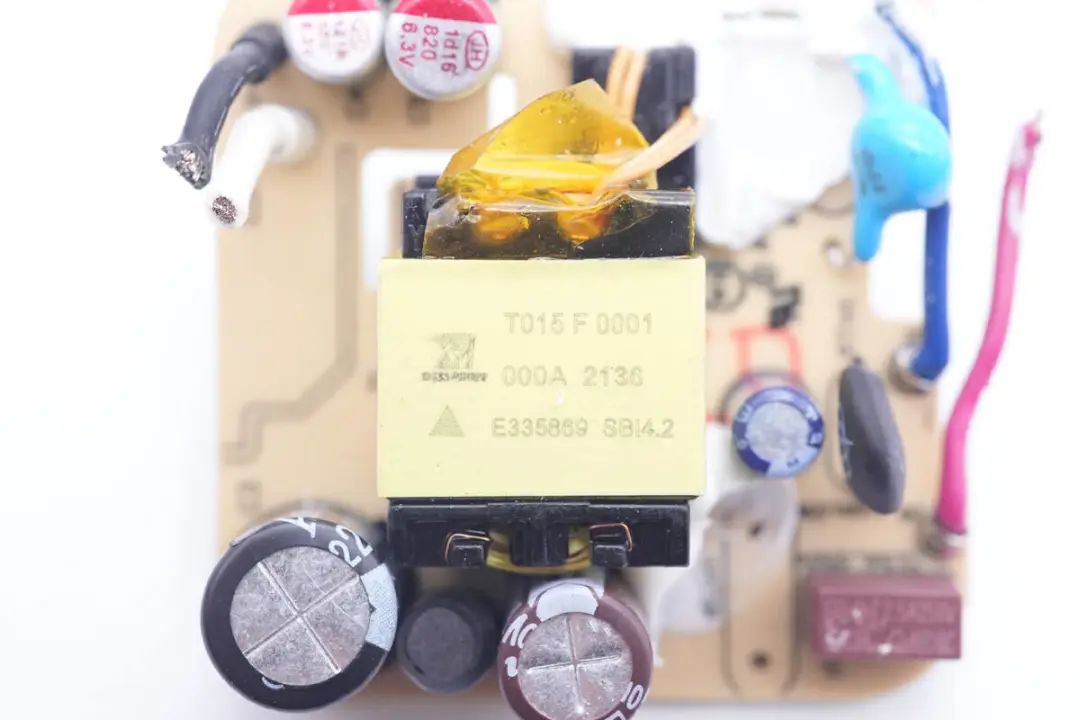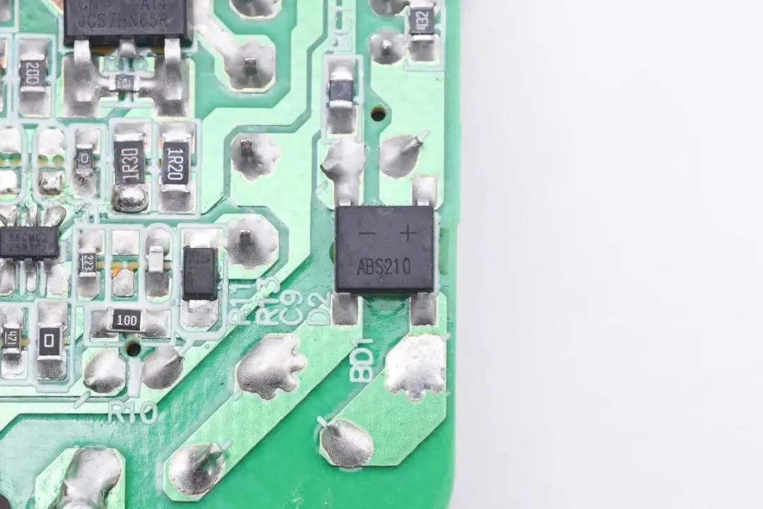 PCBA模块背面焊接整流桥,初级主控芯片,初级开关管,同步整流芯片。通过对PCBA模块的观察发现,这款充电器采用原边反馈架构,无需光耦反馈输出电压,固定电压输出。下面我们就从输入端开始了解这款充电器的用料和设计。