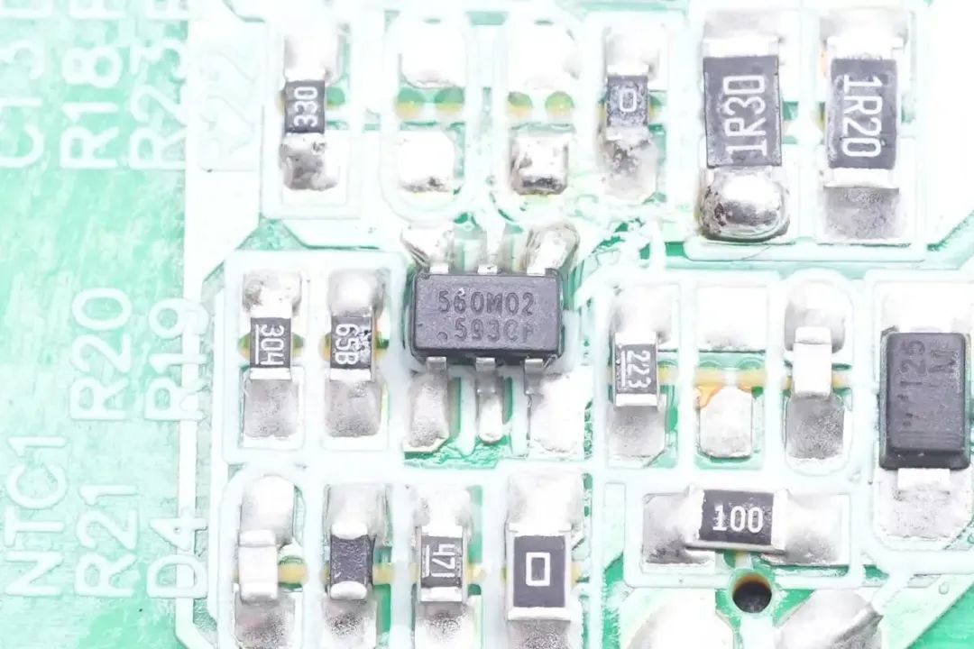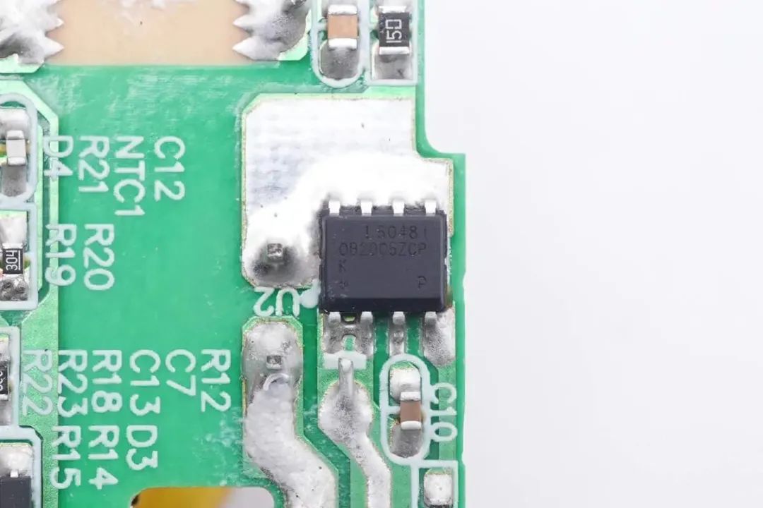 初级主控芯片来自昂宝,型号OB2560,是一颗高性能原边反馈控制器,无需431电压基准和反馈光耦,支持多模式运行以提升效率,具有优秀的动态响应,具备极低的启动电流和工作电流。芯片左下角黑色元件为NTC热敏电阻,用于检测充电器内部温度进行过热保护。
