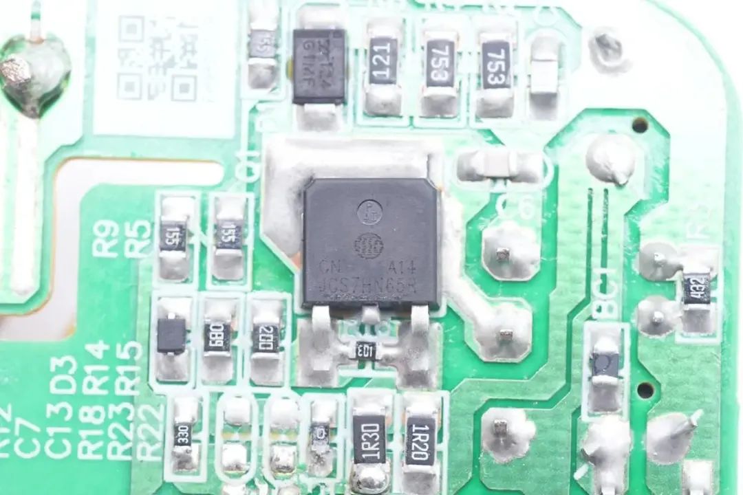 初级开关管来自吉林华微,型号JCS7HN65R,是一颗耐压650V,导阻1.05Ω的NMOS,采用DPAK封装。