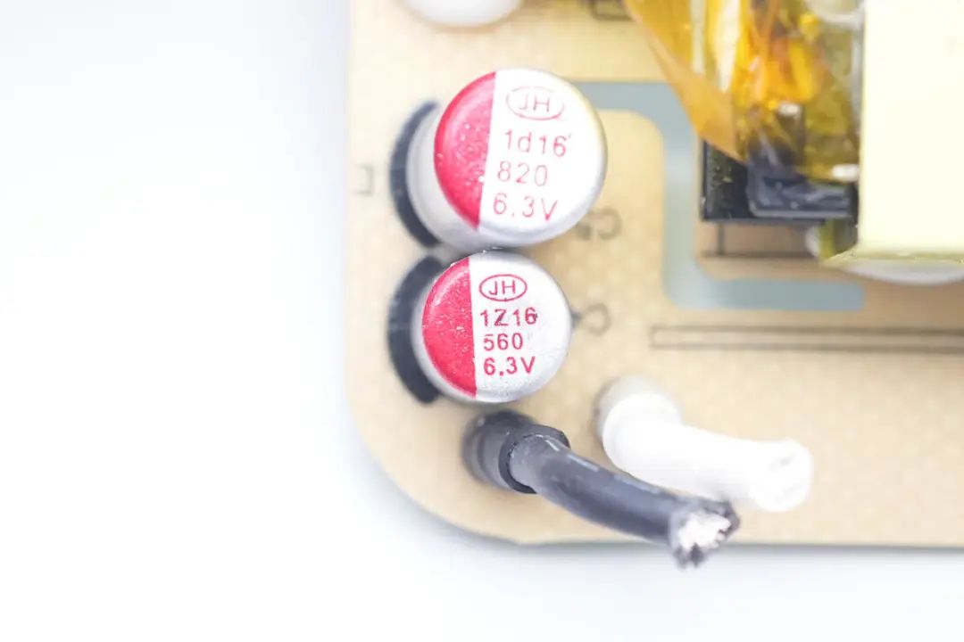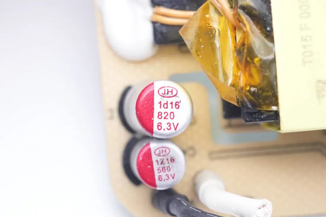 输出滤波电容来自江海,为固态电容,其中一颗规格为820μF 6.3V。