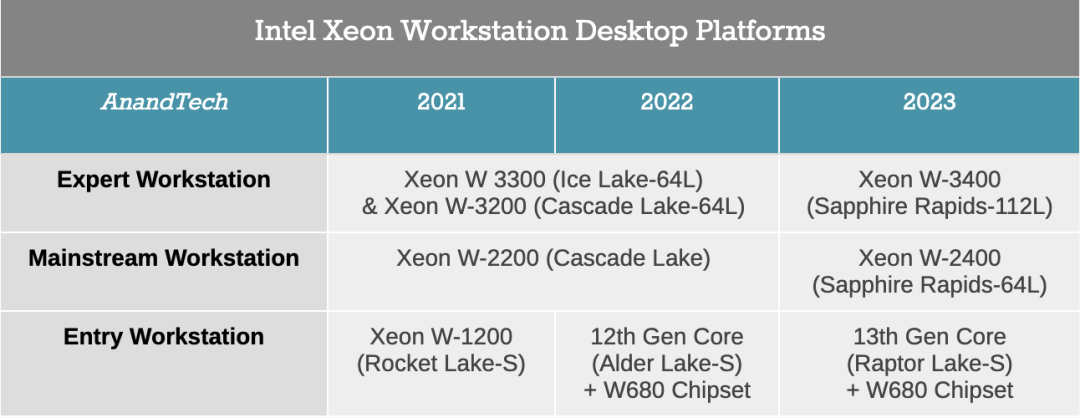 新的至强W系列将取代英特尔之前的至强产品。虽然英特尔确实在2021年推出了一些基于Ice lake的至强产品—至强W-3300系列—这些是对英特尔至强阵容的补充更新,针对需要额外CPU内核或PCIe带宽的特定客户。对于其他人来说,即将推出的至强W系列产品,即大约2019年的W-3200和W-2200系列,都是基于英特尔的Cascade Lake芯片的,这本身是对英特尔Skylake部件的适度更新。因此,推出至强W-3400/2400系列对英特尔工作站阵容的重要性不言而喻:这是英特尔至强系列的一次重大升级。