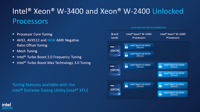 与此同时,如前所述,四款至强W-3400 SKU——w9-3495X、w9-3475X、w7-3465X和w5-3435X——都是“unlocked”处理器。这是英特尔几年来在至强W系列上没有提供的功能,并带来了一些有趣的现象。除了最基本的改变CPU时钟速度乘法器的能力外,“unlocked”处理器还可以调整其AVX和AMX偏移量,以防止处理器在沉重的SIMD负载下下降太多。最后,它们还为网状互连提供了一些调优选项,尽管英特尔没有说具体可以在这里进行调整。
