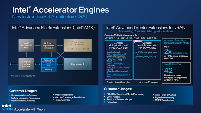 AMX是英特尔在深度学习市场上的重头戏,通过使用更密集的数据结构,超越了他们目前使用AVX-512所能实现的吞吐量。虽然英特尔有AMX支持的GPU(英特尔数据中心Max GPU系列),甚至超越了这一点,但对于Sapphire Rapids,英特尔正在寻求解决需要AI推理的客户群体,这些推理发生在非常接近CPU内核的地方,而不是在一个不太灵活,更专用的加速器中。新的AMX单元还支持Bfloat16,确保英特尔的每一层加速计算块(AVX和AMX)都支持这种用于深度学习的常见中等精度浮点格式。