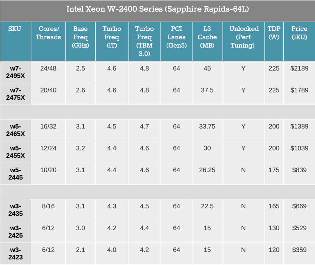 再往下看,我们有Xeon W-2400系列(Sapphire Rapids-64L),它被设计为“主流”工作站平台。Xeon W-2400提供的PCIe通道数量比W-3400 SKU的一半多一点,有64个PCIe 5.0通道可用,内存通道数量减少了一半,达到四个通道。因此,这意味着W-2400系列的价格低于其更强大的W-3400系列,入门级Xeon w3-2423的价格低至359美元。