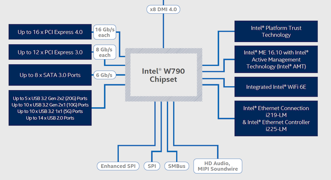 W790芯片组的一些主要功能包括处理器和芯片组之间的直接媒体接口(DMI) 4.0 x8链路,以及多达16个PCIe 4.0通道和支持多达8个SATA 3.0端口。W790还支持5个USB 3.2 Gen2x2 (20Gbps)端口,包括一个Intel Wi-Fi 6E PHY,并可支持2.5 GbE控制器。