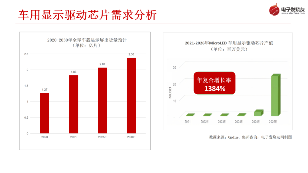 根据Omdia的数据,2020年全球汽车用显示面板出货量仅为1.27亿片,而到了2025年预计突破2亿片,达2.07亿片,年复合增长率为10.26%。2022年车载TFT-LCD销售收入已成功赶超智能手机。此外,在最新一代显示技术上,集邦咨询预测,2021年至2026年MicroLED车用显示驱动芯片产值将以10倍以上的速度增长,年复合增长率高达1384%。