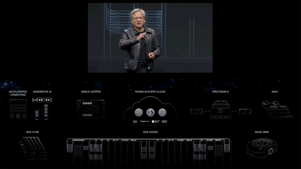 黄仁勋还宣布推出NVIDIA Spectrum-X,这是一个旨在提高基于以太网的AI云的性能和效率的网络平台。