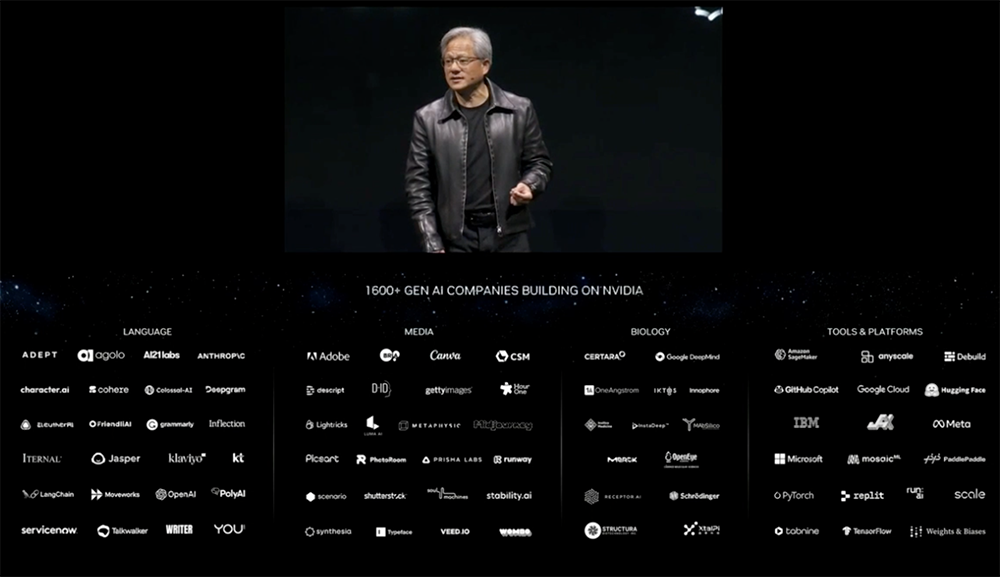 英伟达还发布了MGX服务器规范,为系统制造商提供快速高效构建100多种服务器配置的模块化参考架构。黄仁勋说,有超过1600家生成式AI公司采用了英伟达技术。